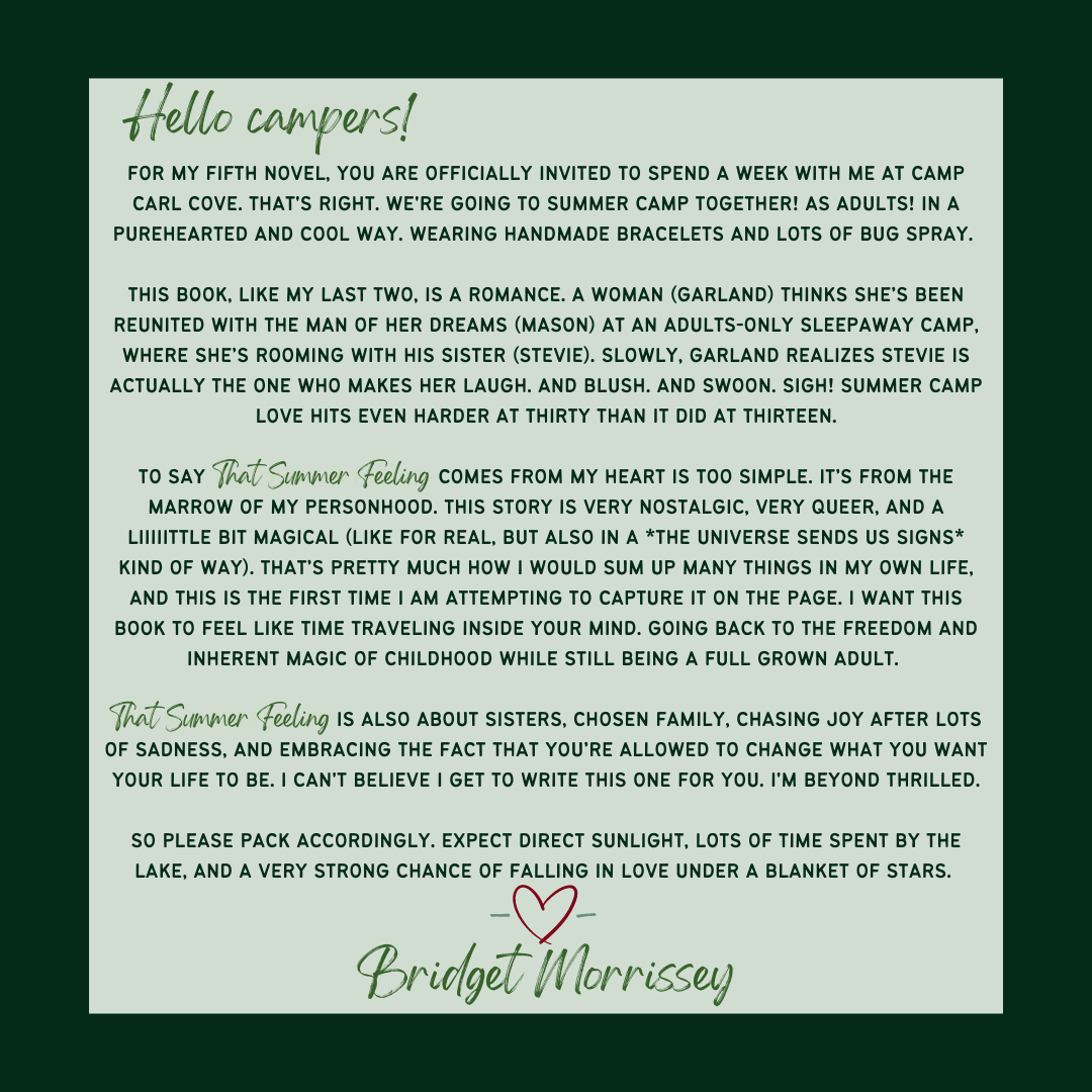 Garland Moore used to believe in magic, the power of optimism, and signs from the universe. Then her husband surprised her with divorce papers over Valentine’s Day dinner. Now Garland isn’t sure what to believe anymore, except that she’s clearly never meant to love again. When new friends invite her to spend a week at their reopened sleepaway camp, she and her sister decide it’s an opportunity to enjoy the kind of summer getaway they never had as kids. If Garland still believed in signs, this would sure seem like one. Summer camp is a chance to let go of her past and start fresh.